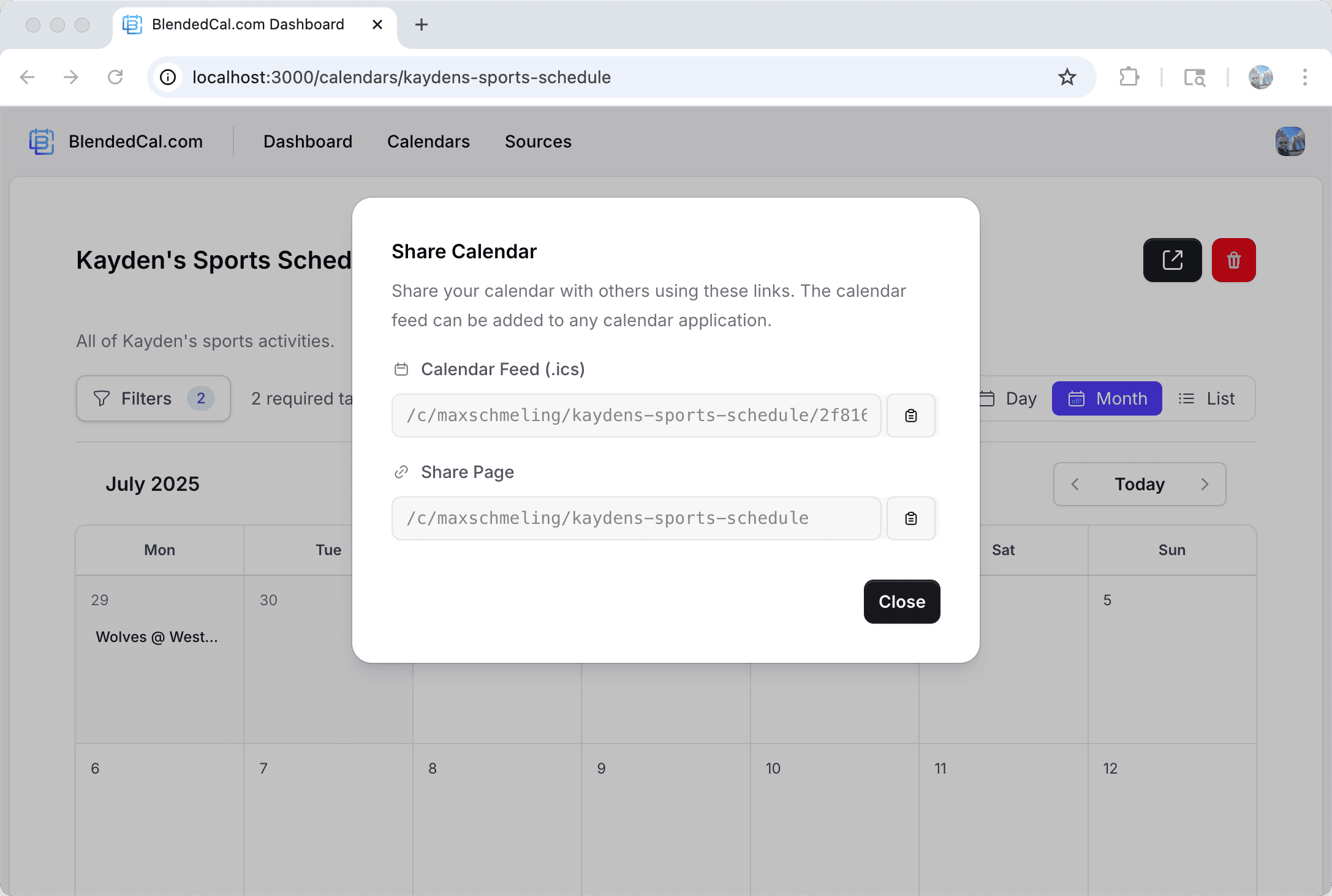 Add your blended calendar to any app via ICS link, or share a public web page with family, coaches, or anyone who needs it.